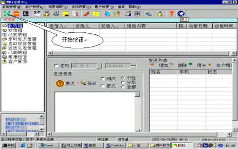 如果沒有上述兩個畫面,則應(yīng)雙擊桌面的前臺和后臺圖標,用以啟動該程序,也可以選擇"開始" --》廣播短信平臺--》前臺(后臺)實現(xiàn)啟動。