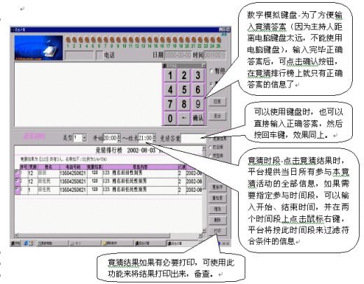 竟猜前必須對聽眾廣播,為了竟猜的準確性,希望發(fā)送信息時,必須把竟猜結(jié)果發(fā)送在前面, 如(12345姓名李立),否則,系統(tǒng)將不能識別其答案。竟猜結(jié)束時,只要點擊竟猜結(jié)果選項,系統(tǒng)會自動將所有參與本節(jié)目的竟猜結(jié)果統(tǒng)計出來(此時沒有限制時間段),如果需要限制時間段,則應(yīng)在"開始"、"結(jié)束"時間段中輸入開始和結(jié)束的時間,并在其中任何一個時間段上點擊鼠標右鍵,系統(tǒng)將會自動過濾出符合條件的信息。