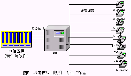 一般來(lái)說(shuō),一個(gè)基于電話(huà)語(yǔ)音識(shí)別的對(duì)話(huà)系統(tǒng)(如圖5所示),一般由識(shí)別服務(wù)器、應(yīng)用服務(wù)器、電話(huà)交換機(jī)、智能交換機(jī)設(shè)備、 IVR設(shè)備等設(shè)備組成,電話(huà)交換機(jī)與成千上萬(wàn)個(gè)電話(huà)終端通過(guò)各種交換設(shè)備相連接,電信應(yīng)用軟件在這些硬件的支持下提供各種服務(wù),如:1860查詢(xún)服務(wù)等。此時(shí),電信應(yīng)用開(kāi)通的線(xiàn)數(shù)視系統(tǒng)的業(yè)務(wù)需求而定,一般總是大大小于終端連接的總數(shù)。系統(tǒng)連接數(shù)與終端連接數(shù)常常是1:1000或者1:10000的級(jí)別。"一路對(duì)話(huà)"是指物理上的一條線(xiàn)路,對(duì)于上述的電信應(yīng)用,電信開(kāi)通的每一條線(xiàn)路都是一路對(duì)話(huà)。
