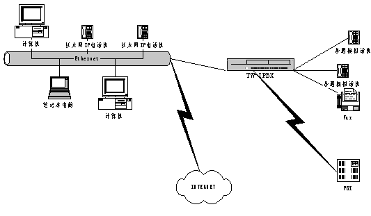 在一個(gè)有很多分支機(jī)構(gòu)的大企業(yè)的分部安裝Tw-IPBX ,通過IP 網(wǎng)絡(luò)與企業(yè)總部PBX 連接后后,可實(shí)現(xiàn)多種應(yīng)用,同時(shí)降低了成本。在這種應(yīng)用場景中,采用了基于IP 的傳輸機(jī)制(VoIP)。此種情況下VoIP的美好之處在于語音和數(shù)據(jù)的IP 傳輸管路需求(根據(jù)呼叫)的無縫可伸縮性,而無需任何靜態(tài)的分區(qū),這種解決方案可提供性能價(jià)格比極高且靈活的網(wǎng)絡(luò)運(yùn)作。