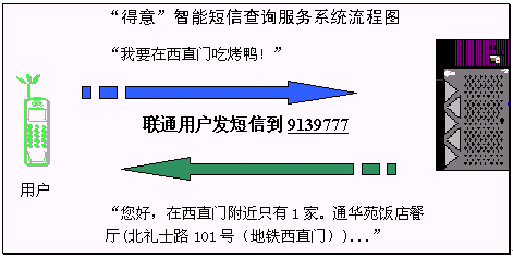 2004年4月15日和4月20日,擁有完全自主知識(shí)產(chǎn)權(quán)的語音與語言技術(shù)開發(fā)商和技術(shù)提供商北京得意音通技術(shù)有限責(zé)任公司(得意公司),在國際上率先把中文自然語言理解技術(shù)應(yīng)用在中國聯(lián)通和中國移動(dòng)短信服務(wù)平臺(tái)上,結(jié)合《精品購物指南》報(bào)社權(quán)威、全面的信息資源,開通了北京地區(qū)餐飲領(lǐng)域智能短信查詢服務(wù)(簡(jiǎn)稱智能短信),并將進(jìn)一步支持互聯(lián)網(wǎng)平臺(tái)和WAP平臺(tái),陸續(xù)開通更豐富和更實(shí)用的智能信息服務(wù)。