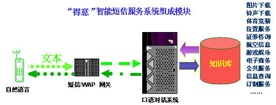 "得意"智能短信系統(tǒng)是在現(xiàn)有的數(shù)據(jù)通信和短信服務(wù)的技術(shù)平臺(tái)上,加入基于中文語言理解技術(shù)的"得意"口語對(duì)話系統(tǒng),從而能夠讓用戶在手機(jī)上以自然語言的形式享受指定領(lǐng)域的智能短信服務(wù)。智能短信系統(tǒng)對(duì)短信文本進(jìn)行自動(dòng)分析和理解,再從知識(shí)庫中提取用戶所需的信息,然后自動(dòng)產(chǎn)生智能應(yīng)答語句,并以短信文本的形式發(fā)回用戶。由于"得意"口語對(duì)話系統(tǒng)具有上下文相關(guān)理解和人機(jī)混合主導(dǎo)等強(qiáng)大功能,在規(guī)定的領(lǐng)域內(nèi),用戶可通過一個(gè)或者多個(gè)短信構(gòu)成一組對(duì)話,完成復(fù)雜的信息查詢或者其他互動(dòng)服務(wù)。