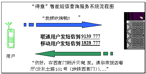 2004年4月15日和4月20日,擁有完全自主知識產(chǎn)權的語音與語言技術開發(fā)商和技術提供商北京得意音通技術有限責任公司(得意公司),在國際上率先把中文自然語言理解技術應用在中國聯(lián)通和中國移動短信服務平臺上,結合《精品購物指南》報社權威、全面的信息資源,開通了北京地區(qū)餐飲領域智能短信查詢服務(簡稱智能短信),并將進一步支持互聯(lián)網(wǎng)平臺和WAP平臺,陸續(xù)開通更豐富和更實用的智能信息服務。