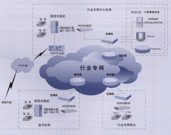 中心并設(shè)立一級(jí)計(jì)費(fèi)認(rèn)證及結(jié)算中心、網(wǎng)絡(luò)管理中心(VBMS),對(duì)網(wǎng)內(nèi)電話集中管理和計(jì)費(fèi)。通過(guò)在各地市機(jī)構(gòu)原有的內(nèi)部網(wǎng)絡(luò)基礎(chǔ)上增加數(shù)臺(tái)VOCABOX實(shí)現(xiàn)語(yǔ)音終端接入,并在地市機(jī)構(gòu)通過(guò)帶FXO接口的VOCABOX實(shí)現(xiàn)內(nèi)部IP電話與內(nèi)部電話網(wǎng)絡(luò)的呼叫轉(zhuǎn)接,網(wǎng)絡(luò)拓?fù)溥B接如下圖所示