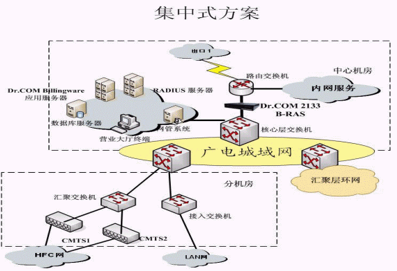 根據(jù)廣電城域網(wǎng)目前網(wǎng)絡(luò)的規(guī)模,以及以后的擴展,采用集中接入認證與計費,統(tǒng)一管理的方案,集中接入指:接入服務(wù)器部署在各個匯聚層的匯聚點,即在網(wǎng)絡(luò)出口安裝寬帶接入服務(wù)器,由寬帶接入服務(wù)器對所有用戶進行身份認證、接入控制、實時計費、數(shù)據(jù)采集,并將賬單和訪問日志等傳送至綜合業(yè)務(wù)系統(tǒng)。統(tǒng)一管理指在中心機房就可以進行全部的管理,包括:網(wǎng)絡(luò)設(shè)備管理;用戶管理;經(jīng)營策略管理;賬務(wù)管理;安全管理;數(shù)據(jù)分析。提供完整的用戶資料分析,使用習(xí)慣分析,運營統(tǒng)計等詳細分析報表。