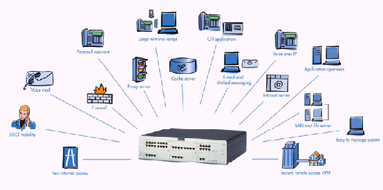 - 一體化:將多項功能集成到一個單一設備中,這些包括:因特網(wǎng)接入、E-mail服務器、局域網(wǎng)、計算機電話集成(CTI)、呼叫管理(嵌入式個人助理及語音信箱,內(nèi)部移動通信等)。