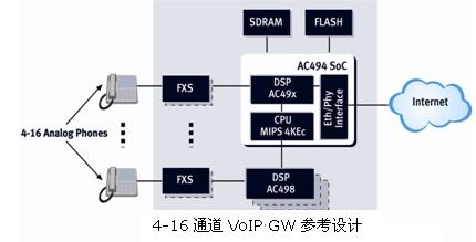 圖1:AudioCodes的片上應用方案:4-16信道VoIP網(wǎng)關參考設計