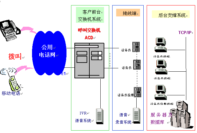 一個完整的呼叫中心解決方案通常由以下核心部分組成:自動呼叫分配(ACD)、交互式語音應(yīng)答(IVR)、計算機(jī)電話綜合應(yīng)用(CTI)、錄音服務(wù)器、呼叫管理(CMS)等。