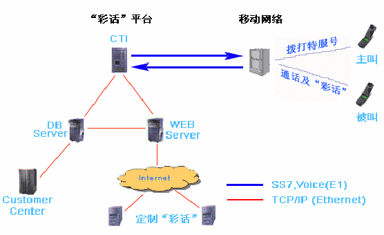 彩話業(yè)務(wù)與CRBT技術(shù)原理基本相同,當(dāng)呼叫進(jìn)入交換機(jī)后,獲取呼叫的主被叫信息后,由交換機(jī)同時(shí)發(fā)起兩個(gè)呼叫,一個(gè)去真正被叫,另一個(gè)去彩話系統(tǒng)。當(dāng)被叫方摘機(jī),首先控制主叫與被叫接通,彩話系統(tǒng)根據(jù)被叫用戶保存的定制的彩話信息和業(yè)務(wù)邏輯控制彩話系統(tǒng)的IVR單元對(duì)主被叫的通話進(jìn)行相應(yīng)的背景語(yǔ)音播放操作,該語(yǔ)音僅作為背景音樂(lè),不影響正常的雙方通話,類似于作一個(gè)三方會(huì)議的操作。當(dāng)被叫掛機(jī)時(shí),交換機(jī)將IVR單元和被叫的連接斷開(kāi)。
