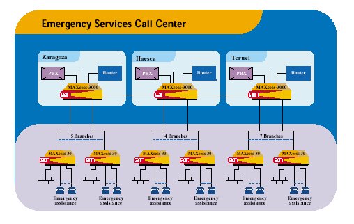 在阿拉貢地區(qū)撥打112可以接通Zaragoza、Huesca或Teruel三地的最近的呼叫中心。在接線員點擊電子地圖上呼叫方所在位置后,呼叫便通過MAXcess設備自動路由到離呼叫方最近的分支機構的專用電話上。接下來,該分支機構便立即派出緊急救護車。接線員輸入到系統(tǒng)中的有關事件的信息也可以通過LAN立即到達遠端MAXcess。