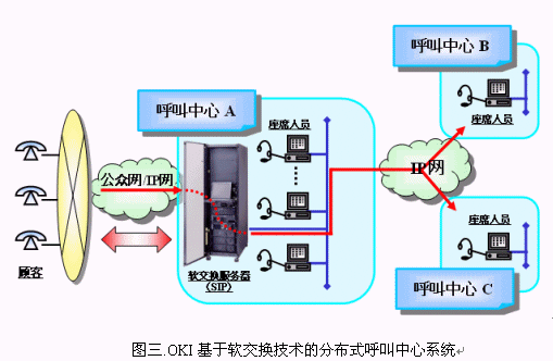 軟交換(Soft Switch)技術(shù)的出現(xiàn)實(shí)現(xiàn)了上述想法。目前,采用軟交換技術(shù)的呼叫中心已經(jīng)在中國(guó)市場(chǎng)展露頭角。其中,日本通信企業(yè)沖電氣(OKI)工業(yè)株式會(huì)社在中國(guó)推出的以軟交換為核心技術(shù)的新一代呼叫中心是較為典型的代表。