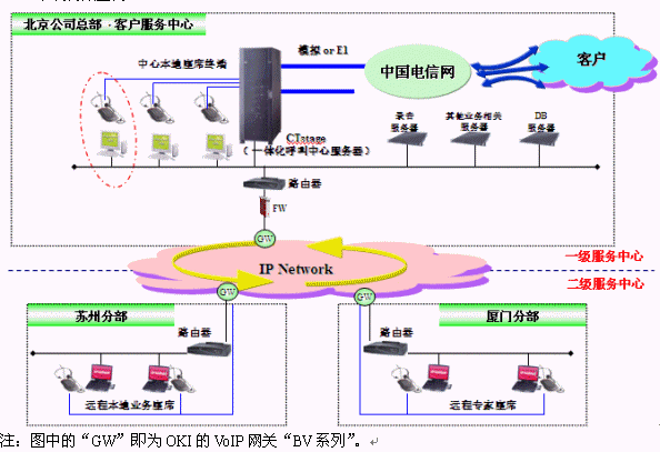 OKI的IP客服中心可以將各個(gè)分點(diǎn)和服務(wù)器間用VoIP網(wǎng)關(guān)連接。OKI的VoIP網(wǎng)關(guān)"BV系列",是在"MOS(Mean Opinion Score)"和"PESQ(Perceptual