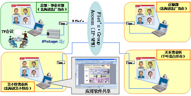 此次開(kāi)始投入運(yùn)行的IP電話系統(tǒng),在其總部導(dǎo)入了“IPstage SX”,通過(guò)沖電氣的“Com@WILL軟電話”具有的TV會(huì)議功能,能將包括總部在內(nèi)的北海道3個(gè)事業(yè)所與關(guān)東營(yíng)業(yè)所進(jìn)行電話聯(lián)網(wǎng)。各個(gè)事業(yè)所之間通過(guò)NTT東日本的IP-VPN服務(wù)“Flet's・Group”實(shí)現(xiàn)相互連接。