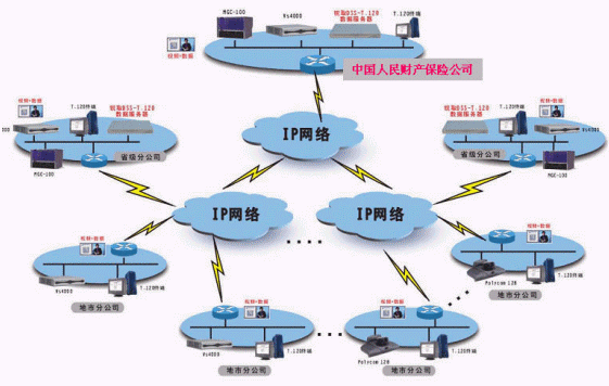 中國人民財(cái)產(chǎn)保險(xiǎn)股份有限公司,是中國內(nèi)地最大的非壽險(xiǎn)公司,香港證交所上市公司。經(jīng)過50多年的發(fā)展,中國人保財(cái)險(xiǎn)公司已經(jīng)發(fā)展成為網(wǎng)點(diǎn)遍布全國31個(gè)省市區(qū),共有營業(yè)機(jī)構(gòu)4000余個(gè)的大型商業(yè)公司。為提高辦公效率,降低差旅成本,中國人保財(cái)險(xiǎn)公司決定建設(shè)覆蓋從總公司、省分公司到地市分公司的視頻會(huì)議系統(tǒng),項(xiàng)目總?cè)萘窟_(dá)600多個(gè)節(jié)點(diǎn),采用兩級級連方式組網(wǎng),要求系統(tǒng)具備視頻、音頻、數(shù)據(jù)交互功能,。