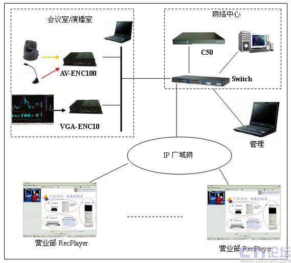 在分析了海通證券的實際需求和網(wǎng)絡(luò)環(huán)境以后,決定采用一套DSS-R-C50+來組建整個媒體廣播系統(tǒng)。系統(tǒng)由媒體采集系統(tǒng)AV-ENC100/VGA-ENC100,流媒體處理和錄制系統(tǒng)C50和媒體接收系統(tǒng)RecPlayer組成。通過此系統(tǒng)可以實現(xiàn)語音、視頻和計算機(jī)桌面的同步實時直播、錄制和點(diǎn)播。系統(tǒng)的結(jié)構(gòu)圖如下: