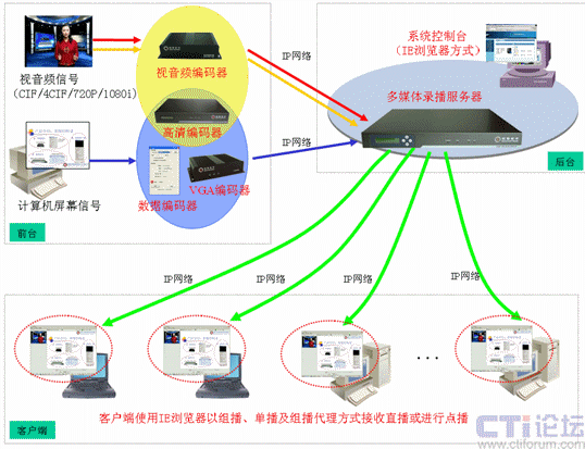 如上圖所示,會易錄采用分布式產品架構,前臺設備負責信號采集,后臺設備負責信號處理,前臺的編碼器可將采集的視音頻信號或VGA信號編碼后通過IP網絡發(fā)送給后臺的多媒體錄播服務器,多媒體錄播服務器可將收到的視音頻信號和VGA信號進行同步一體化的錄制,并提供直播及點播。