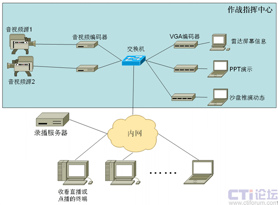 在軍隊系統(tǒng)中比較典型的應用是軍隊作戰(zhàn)演習的錄播。軍隊中常會進行軍事演習、網上模擬對抗訓練,以此來增強現(xiàn)代化軍隊的作戰(zhàn)能力,演習指揮部在作戰(zhàn)指揮中心通過大屏等顯示設備全盤了解對抗雙方動態(tài),以往缺乏有效的演習記錄手段,不利于事后分析及總結經驗教訓。會易錄支持多路AV和VGA信號的同步組合錄制,可以把演習過程中作戰(zhàn)指揮中心顯示的信息進行全面的錄制,如對抗雙方的視音頻信息、網上沙盤推演動態(tài),雷達屏幕信息等內容,同時也可以通過網絡將上述信息實時傳送給上級部門來進行網上演習的在線觀摩。該錄播系統(tǒng)的典型框圖如下: