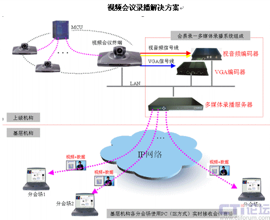 由于該衛(wèi)生局有太多個(gè)衛(wèi)生辦事處,點(diǎn)多面廣,如采用MCU的方式,投資巨大,可行性較差。采用錄播系統(tǒng)將該衛(wèi)生局視頻會(huì)議系統(tǒng)延伸到縣,經(jīng)濟(jì)可行,實(shí)際效果良好,具有很好的推廣使用價(jià)值。