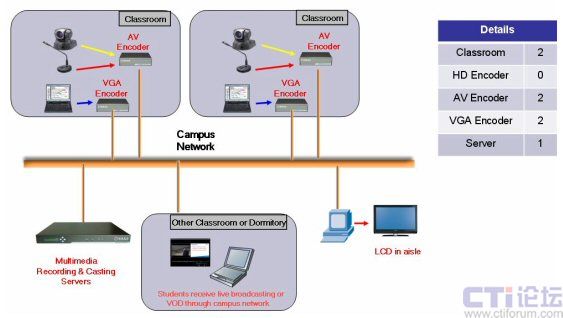 如上圖所示,服務(wù)器型號(hào)為DSS-R-T2,T系列的產(chǎn)品是銳取公司專門(mén)應(yīng)用于教育行業(yè)的產(chǎn)品。T2可支持兩個(gè)教室的同時(shí)錄制與直播,放置在學(xué)校數(shù)據(jù)中心的機(jī)房中。兩個(gè)AV Encoder和兩個(gè)VGA Encoder分別放置在需要做錄制直播的教室中。學(xué)生通過(guò)校園網(wǎng)或者Internet連接到服務(wù)器即可收看多媒體教學(xué)的直播,包括老師的圖像聲音以及講解的課件內(nèi)容。在教學(xué)樓中,每一層的走廊里都安裝了大的LCD顯示屏,服務(wù)器上的多媒體內(nèi)容也將同時(shí)傳到這些顯示屏上。