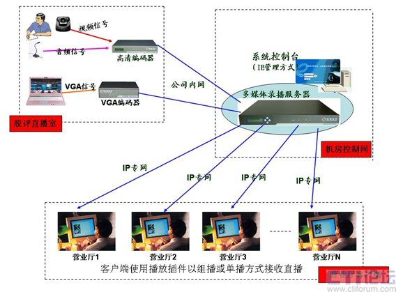 如上圖所示,在多媒體股評(píng)直播室中,股評(píng)師的講解圖像和聲音以及電腦中分析數(shù)據(jù)同步傳輸采集到控制機(jī)房中,通過(guò)多媒體錄播服務(wù)器直播模塊的組播方式將信息傳達(dá)給全國(guó)遍布的營(yíng)業(yè)網(wǎng)點(diǎn),實(shí)現(xiàn)股評(píng)直播的需求。(權(quán)威股評(píng)師將在每天下午股市休市后對(duì)一天當(dāng)中股票大盤(pán)做一次全面的分析,并對(duì)本周或某行業(yè)的形式做一個(gè)全面的總結(jié),并對(duì)未來(lái)形勢(shì)做出判斷。)