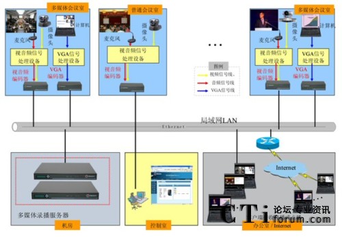 如上圖如圖所示,在兩間多媒體會(huì)議室內(nèi)配備了銳取多媒體錄播系統(tǒng)前端的視音頻編碼器和VGA編碼器,視音頻編碼器負(fù)責(zé)采集會(huì)議、培訓(xùn)中的視音頻信號(hào),VGA編碼器負(fù)責(zé)采集幻燈片的VGA圖像內(nèi)容。其他普通會(huì)議室只使用視音頻編碼器采集視音頻信號(hào)。前端的編碼器采集信號(hào)并編碼后通過(guò)網(wǎng)絡(luò)發(fā)送給后端機(jī)房?jī)?nèi)的銳取多媒體錄播服務(wù)器,多媒體錄播服務(wù)器接收多間會(huì)議室的信號(hào)進(jìn)行組合錄制、直播、點(diǎn)播。