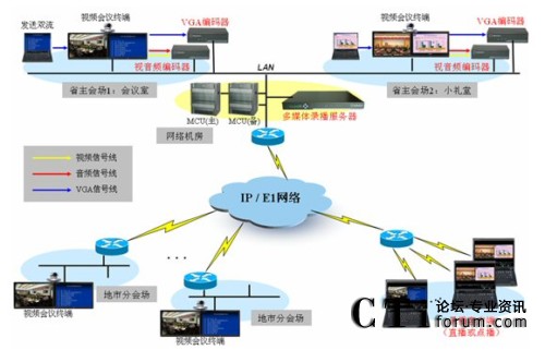 項(xiàng)目中采用了一套銳。ǚ植际剑┒嗝襟w錄播系統(tǒng),其中多媒體錄播服務(wù)器一臺,部署在網(wǎng)絡(luò)機(jī)房;兩套編碼器分別部署在會議室和小禮堂,編碼器從視頻會議終端獲取視音頻及雙流信號,并通過IP網(wǎng)絡(luò)發(fā)送給機(jī)房內(nèi)多媒體錄播服務(wù)器,由多媒體錄播服務(wù)器實(shí)現(xiàn)視頻會議的錄制、直播和點(diǎn)播,該服務(wù)器支持2組會議并發(fā)錄播,可滿足2組并發(fā)視頻會議的錄播需要。分會場及不具備視頻會議終端的地方,可使用電腦登陸多媒體錄播服務(wù)器來接收會議的實(shí)時直播或在會后進(jìn)行點(diǎn)播。