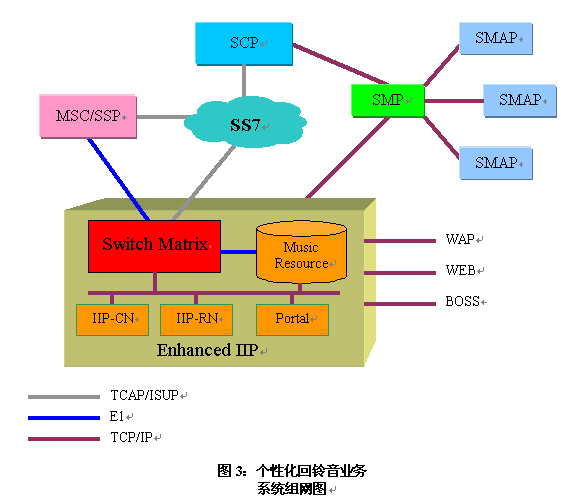 個(gè)性化回鈴音業(yè)務(wù)是基于智能網(wǎng)平臺(tái)實(shí)現(xiàn)的全新增值智能業(yè)務(wù),采用被叫簽約信息T-CSI觸發(fā)的方式。具體實(shí)現(xiàn)時(shí)利用現(xiàn)有智能網(wǎng)結(jié)構(gòu),將業(yè)務(wù)邏輯加載在SCP上,MSC/SSP根據(jù)用戶(hù)的歸屬HLR中的T-CSI信息,觸發(fā)智能業(yè)務(wù)到用戶(hù)歸屬的SCP上,并進(jìn)行相應(yīng)的業(yè)務(wù)控制處理。在呼叫過(guò)程中,由SCP控制獨(dú)立IP,向用戶(hù)提供音樂(lè)回鈴音。其中的Switch