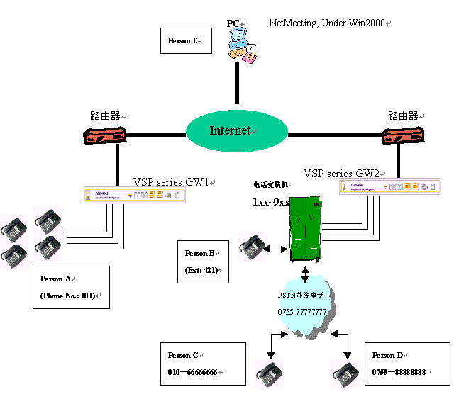 1、 兩臺語音網(wǎng)關(guān),分別為 GW1 和GW2,與另外一臺電腦同時連接在internet上。