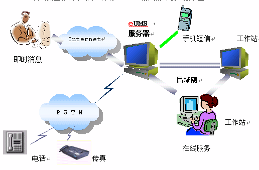 用戶電話撥入(或通過交換機(jī)接入), eUMS的電話接入和傳真接入模塊負(fù)責(zé)接入,提示語音導(dǎo)航,根據(jù)用戶的指令完成操作,并根據(jù)預(yù)先的設(shè)置將留言信息轉(zhuǎn)發(fā)到用戶的電子郵件信箱,或通過手機(jī)短信網(wǎng)關(guān)短信通知。如果對方發(fā)送傳真,eUMS會把傳真存儲在指定的傳真信箱中,或者發(fā)送到指定的電子郵件信箱中。如果預(yù)先設(shè)置了傳真轉(zhuǎn)發(fā),系統(tǒng)會將收到的傳真轉(zhuǎn)發(fā)到另外一部傳真機(jī)上。
