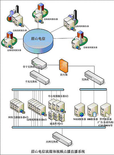 2004年10月隨著四川眉山電信公司寬帶網(wǎng)建設(shè)的日益完善和寬帶接入業(yè)務(wù)的迅速發(fā)展,公司原先擁有一套簡單的流媒體服務(wù)系統(tǒng),從功能和性能上都不能滿足業(yè)務(wù)的需要,公司決定建設(shè)一套運營級的流媒體視頻服務(wù)系統(tǒng),提供3000個并發(fā)的視頻點播服務(wù)和8路的網(wǎng)絡(luò)電視直播、并提供DRM文件的加密下載。