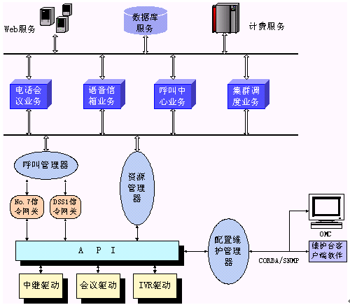 。。其中呼叫管理器通過CORBA技術(shù)向業(yè)務(wù)層提供2個軟件接口,資源管理器通過CORBA向業(yè)務(wù)層提供6個軟件接口。