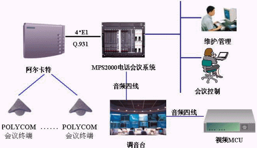 國電中心的音頻電話會議系統(tǒng)采用MPS2000電話會議系統(tǒng)。MPS2000電話會議系統(tǒng)通過4個E1與阿爾卡特的4400交換機相連,采用Pri信令,用戶通過POLYCOM的會議終端機參加會議;MPS2000電話會議系統(tǒng)通過音頻四線與調(diào)音臺相連,并通過調(diào)音臺與視頻MCU相連,同時MPS2000電話會議系統(tǒng)通過以太網(wǎng)與其內(nèi)部的局域網(wǎng)相連,同時在局域網(wǎng)內(nèi)設(shè)置一臺維護(hù)終端用于對系統(tǒng)的維護(hù)管理,會議控制臺通過WEB方式對會議進(jìn)行控制。