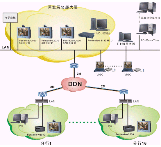 整個(gè)深圳發(fā)展銀行會(huì)議電視系統(tǒng)組網(wǎng)分為兩級(jí),中心點(diǎn)3套Penteview2030到下面的16個(gè)異地的分支行。深圳發(fā)展銀行大廈6樓大會(huì)議室、培訓(xùn)小會(huì)議室、32樓會(huì)議室作為主會(huì)議室,在6樓的機(jī)房中放置主MCU和一個(gè)終端,培訓(xùn)小會(huì)議室放置一個(gè)終端,其他16個(gè)異地分支行分別放置一臺(tái)Penteview2030終端,通過現(xiàn)有的深發(fā)展DDN網(wǎng)絡(luò)相互連通。根據(jù)深發(fā)展通信網(wǎng)絡(luò)結(jié)構(gòu)及傳輸容量的實(shí)際情況,會(huì)議電視系統(tǒng)采用星型拓?fù)溥B接,各地可通過現(xiàn)有的DDN專線劃出768K-2M的帶寬,進(jìn)行視頻會(huì)議的方式組建起多點(diǎn)會(huì)議電視系統(tǒng)。提供的方案為:MCU選擇支持H.323的MCU Penteview 6180,終端采用支持H.323的Penteview 2030;