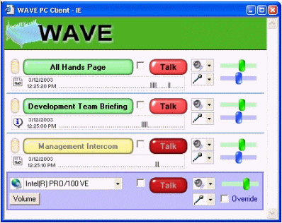 WAVE的使用方式為:管理員在服務(wù)器端建立IP電話會議,參加者使用本地計算機作為客戶端,通過耳機和麥克風(fēng)即可加入會議。一臺普通的奔四PC機可以支持?jǐn)?shù)千個會議,每個會議也允許數(shù)百個用戶參加。管理員可以分配用戶不同的權(quán)利:如講話,主持會議等等。