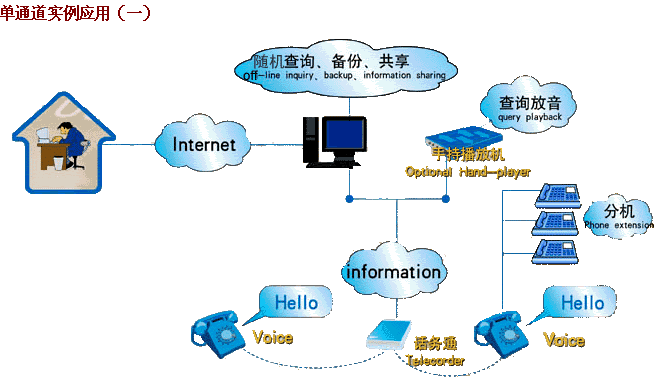錄音記錄應當能夠方便地通過多種途徑回放,實現(xiàn)對錄音記錄資料的利用,這也是用戶配置電話錄音系統(tǒng)的最主要目的。回放可以通過我們公司開發(fā)生產(chǎn)的選件手持播放器回放,通過網(wǎng)絡回放,通過聲卡在其它計算機上回放等多種方式來實現(xiàn)。