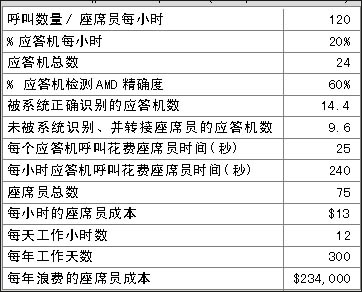 表1和表2表明在一個呼叫中心中精確的應答機檢測(AMD)給企業(yè)所帶來的價值,兩表之間關于呼叫中心運營的費用每年相差$175,500。那么不同的AMD精確度意味著什么?在上例中,精確度每增加1%意味著每年會減少約$5,850的損失。