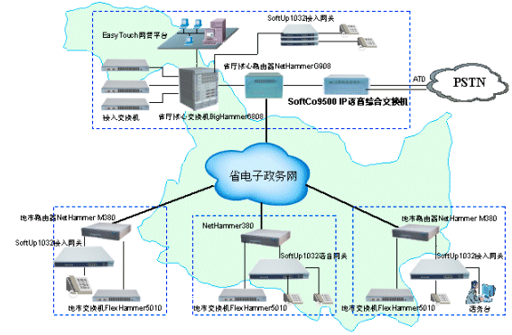 ×省×廳和與各地市局之間原來采用PSTN網(wǎng)絡(luò)實現(xiàn)語音通信,省局和市局,市局和市局之間每個月的通訊費(fèi)用高達(dá)數(shù)萬元,無形之中長途電話費(fèi)用已經(jīng)成為日常行政支出中很大的一部分。該廳已經(jīng)采用港灣公司NetHammer