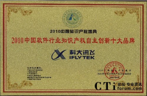 CTI論壇(ctiforum)4月29日消息(記者 潘婷婷):2010年4月25日,由中國(guó)知識(shí)產(chǎn)權(quán)研究會(huì)、中國(guó)專利保護(hù)協(xié)會(huì)、中國(guó)版權(quán)協(xié)會(huì)等單位聯(lián)合舉辦的“2010中外企業(yè)知識(shí)產(chǎn)權(quán)大會(huì)”在人民大會(huì)堂隆重舉行。在當(dāng)日的“2010中國(guó)知識(shí)產(chǎn)權(quán)盛典頒獎(jiǎng)典禮”中,科大訊飛憑借強(qiáng)大的自主創(chuàng)新能力以及在知識(shí)產(chǎn)權(quán)創(chuàng)造、保護(hù)與應(yīng)用方面的突出表現(xiàn)獲評(píng)“2010年中國(guó)軟件行業(yè)知識(shí)產(chǎn)權(quán)自主創(chuàng)新十大品牌”。