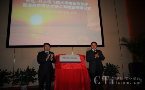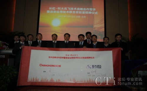 CTI論壇(ctiforum)12月14消息(記者 潘婷婷): 12月12日,科大訊飛與長虹集團戰(zhàn)略合作簽約暨共建聯(lián)合實驗室揭牌儀式在科大訊飛語音產(chǎn)業(yè)基地研發(fā)大樓隆重舉行。根據(jù)合作框架協(xié)議,雙方將在戰(zhàn)略聯(lián)盟的基礎上,以共建聯(lián)合實驗室為主要載體,旨在依托各自行業(yè)領(lǐng)域的長期積淀優(yōu)勢、強強聯(lián)合,達成戰(zhàn)略互信,加強緊密合作,積極推動“語音核心引擎+智能終端平臺” 的特色應用模式,深入拓展智能語音科技在智能電視等終端產(chǎn)品市場的應用范圍,合力開創(chuàng)智能語音終端創(chuàng)新應用市場空間。