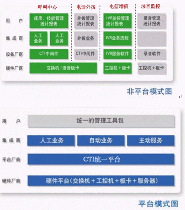 非平臺(tái)模式的系統(tǒng)建設(shè)需要采用多家設(shè)備,如不同廠家的交換機(jī)、語音板卡、CTI中間件、IVR服務(wù)軟件、錄音設(shè)備,以及相互獨(dú)立的、沒有統(tǒng)一設(shè)計(jì)的系統(tǒng)維護(hù)工具和業(yè)務(wù)界面。而平臺(tái)模式的系統(tǒng)建設(shè)只需要采用一家的設(shè)備,各業(yè)務(wù)模式在一個(gè)平臺(tái)上實(shí)現(xiàn),具備統(tǒng)一的管理工具。