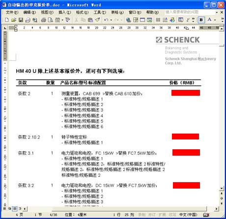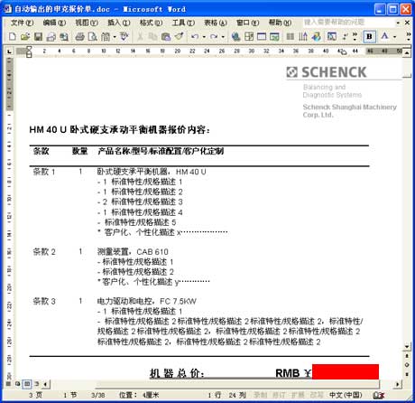以上海申克的報(bào)價(jià)單為例。與其說它是一份報(bào)價(jià)單,不如說它是一套幾十頁的客戶化復(fù)雜方案書,它由各方面數(shù)據(jù)和文檔自動合并、輸出為一份Word文件:
