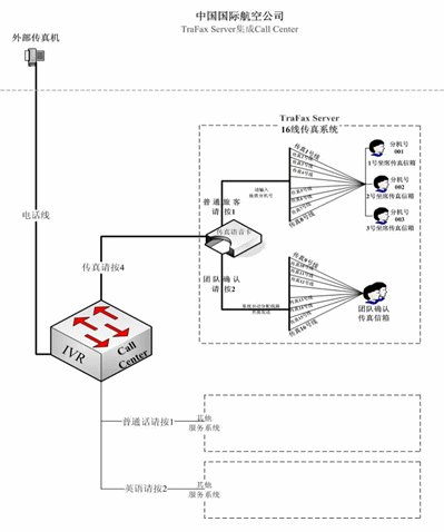 與國(guó)航Call Center集成后的TraFax Server系統(tǒng)共有16條傳真線路,其中一半專門(mén)用作接收普通旅客發(fā)來(lái)的傳真,另外8條線路則是為受理團(tuán)體客戶的傳真確認(rèn)而設(shè)。二者不同是,普通客戶在向國(guó)航發(fā)送傳真的過(guò)程中需要根據(jù)系統(tǒng)提示音在發(fā)送前的最后環(huán)節(jié)中輸入明確的坐席分機(jī)號(hào)碼,以使傳真文件發(fā)向分機(jī)號(hào)對(duì)用的坐席傳真信箱中,以此實(shí)現(xiàn)坐席人員對(duì)旅客的一對(duì)一式服務(wù),從而提高服務(wù)水平。而團(tuán)隊(duì)確認(rèn)的傳真無(wú)需輸入坐席分機(jī)號(hào),傳真將被空閑的線路直接發(fā)送到一個(gè)專門(mén)的團(tuán)隊(duì)確認(rèn)傳真信箱中,從而確保國(guó)航對(duì)該類傳真的快速處理能力。目前,16線的TraFax