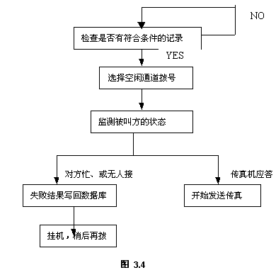 傳真發(fā)送功能是服務(wù)器后臺操作的,系統(tǒng)定時檢查傳真發(fā)送庫,一旦有符合條件的記錄,自動選擇空閑端口,按設(shè)定的傳真號碼撥號,檢查被叫方的狀態(tài),若對方有傳真機應(yīng)答,則開始發(fā)送傳真;若對方忙、或無人接,系統(tǒng)稍后會再次試撥。若超過設(shè)定次數(shù)仍未發(fā)送成功,系統(tǒng)會通知發(fā)送人作其它處理。