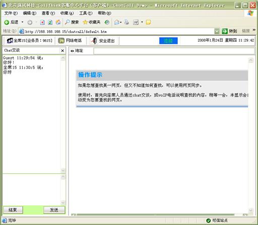 網(wǎng)頁(yè)同步:客戶在通過"客服代表回復(fù)"、"互聯(lián)網(wǎng)電話"、"文字交談"等方式與客服代表進(jìn)行實(shí)時(shí)交流時(shí),還可以通過網(wǎng)頁(yè)同步功能,與客戶代表的瀏覽器進(jìn)行同步。這樣,客戶與客戶代表看到的是同一網(wǎng)頁(yè),由客戶代表引導(dǎo)客戶對(duì)網(wǎng)頁(yè)進(jìn)行瀏覽,找到所需要的信息。網(wǎng)頁(yè)同步功能適用于不同的實(shí)時(shí)交流方式,可以大大提高客戶服務(wù)的效率和質(zhì)量。如圖14、15所示: