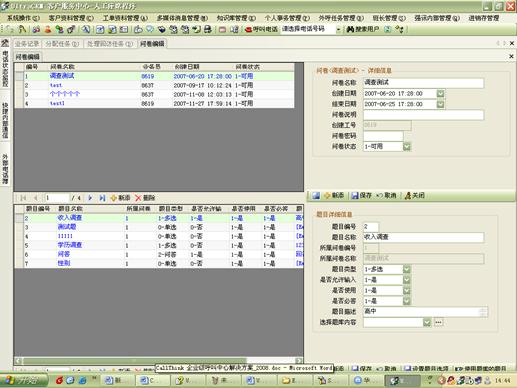 外呼中還可以建立問卷調(diào)查任務(wù)。同時(shí)還提供題庫(kù)管理、問卷編輯等功能,并且題目之間還可以設(shè)計(jì)流轉(zhuǎn)順序。方便使用者靈活設(shè)定問卷內(nèi)容。如圖20、21所示: