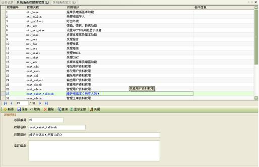 系統(tǒng)設(shè)置了多種對(duì)crm系統(tǒng)操作的權(quán)限,如圖27所示。這些權(quán)限方便管理人員根據(jù)坐席的不同情況,工作的內(nèi)容來(lái)自由組合這些權(quán)限。