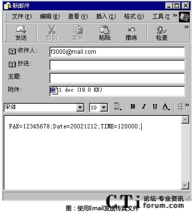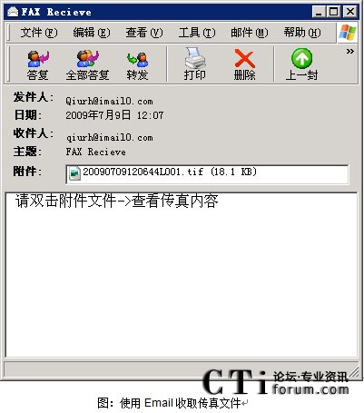 - 電子郵件提交:用戶使用電子郵件應用程序(如Notes或 Outlook)直接提交傳真,傳真文件為 tif、word、excel、txt、html、jpg等格式的文件;