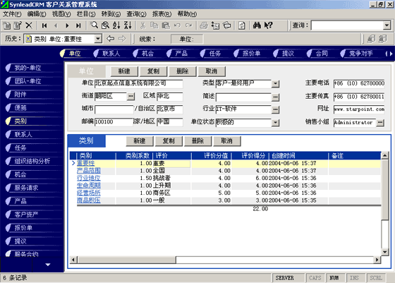 客戶單位的分類較聯(lián)系人的分類更復(fù)雜。常用的分類有:按照企業(yè)規(guī)模來分類(大、中、小,層次自定義,下同)、按照該客戶與本單位的緊密程度分類(緊密、普通、疏遠(yuǎn))、按照該客戶的重要性分類(重要、普通、次要)、按照該客戶的忠誠度分類(忠誠、普通、游移)。有一些用戶企業(yè),希望對客戶單位特征進(jìn)行采集,進(jìn)而進(jìn)行客戶信用評價。信用特征的類別可以多達(dá)數(shù)十種類(詳細(xì)情況可參考有關(guān)書籍)。利用SynleadCRM,您可以為每個類指定系數(shù),為類下屬的每個評價指定評分分值。例如,您可以建立一個類別為"客戶倉庫積壓商品的情況",系數(shù)為1,該類別下屬的評價有"很多1分"、"一般3分"、"少1分"、"未知0分",如果指定某客戶該類別的評價為一般,則該項目得分為3分*1(系數(shù))=3分。依此類推,您還可以指定更多的分類與評價,例如:客戶經(jīng)營場所所處的位置、客戶在企業(yè)生命周期中所處的位置、客戶在行業(yè)中的地位、客戶產(chǎn)品的組合情況、客戶產(chǎn)品覆蓋的市場范圍、客戶產(chǎn)品的淡旺季規(guī)律、客戶近年營業(yè)額的增減趨勢、客戶的年度營業(yè)額、客戶的現(xiàn)金周轉(zhuǎn)能力、客戶的負(fù)債情況、客戶是否涉及中大訴訟等。每一個類別項目的評分經(jīng)過系數(shù)的加權(quán)運算后,可以求和,得到這個客戶的總評分。未來也可以利用分析模型對此類數(shù)據(jù)進(jìn)行進(jìn)一步的分析,提供輔助決策所需要的圖表和報表。