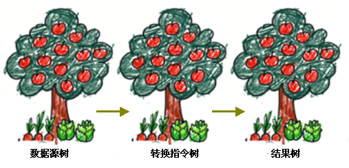 一棵或多棵數(shù)據(jù)源樹(XML數(shù)據(jù)源文件),通過一棵轉(zhuǎn)換指令樹(選擇數(shù)據(jù)、表達數(shù)據(jù)表現(xiàn)形式的模板文件),獲得了一棵結(jié)果樹(圖表、報表)。
