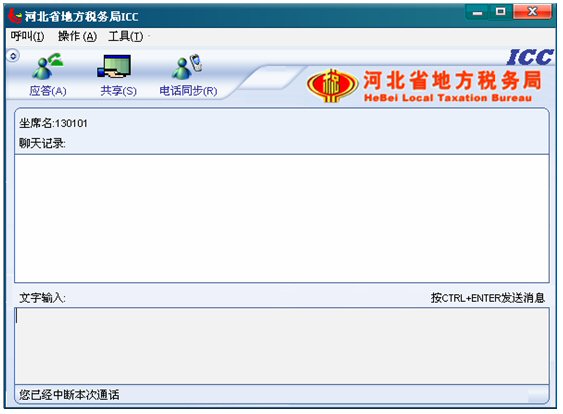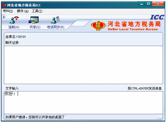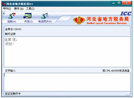 輸入文字信息后按CTRL+ENTER就可發(fā)送消息。輸入的文字可以在 ICC界面上面的聊天記錄對話框中顯示,同時(shí)發(fā)送給納稅人。如下圖: